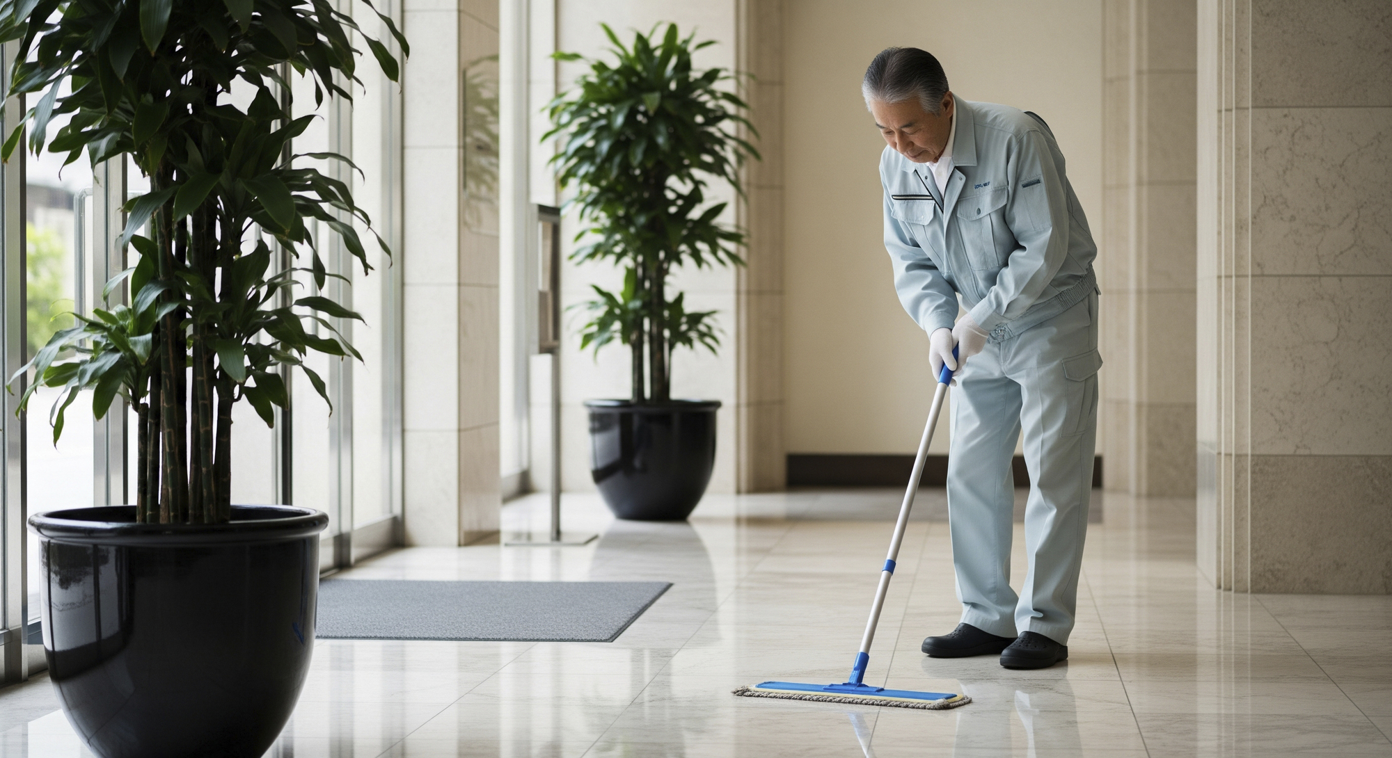 床・ガラス清掃: ポリッシャーによる床洗浄やワックスがけ、高所のガラス清掃など、専門技術で建物を輝かせます。